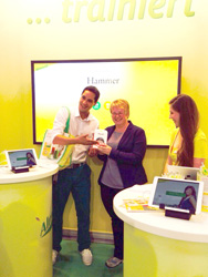 Expopharmには多くの薬局関連企業が参加しブースを出展します。ドイツ国内外から薬剤師・PTAだけでなく薬事関係者が訪れます。参加企業が自社新製品をここぞとばかりに紹介します。この見本市は、発売前の新製品のお披露目の場でもあります。どの会社も訪問者に自社製品を購入してもらおうと、いろいろな工夫を凝らします。医薬品、化粧品会社の他、薬局で使うコンピュータシステム会社、機器メーカー、薬局内装会社など薬局に関するものなら何でもありです。薬局開設希望者、薬局経営上新しいアイデアを見つけたい方はまずここを訪れます。この見本市は製品を実際に見て試してみる大変良い機会です。私たちPTAにとっても多くの新しいことを発見し学ぶ場です。またサンプルやパンフレットを沢山持ち帰ることができ、訪問者には至れり尽くせりの場でもあります。