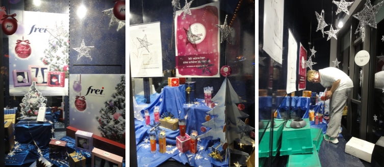 初めまして、私はナディーン・ハンマーです。PTAの資格を取得して12年になります。2年前から、ロッテンブルク市のセントラル薬局(アッセンハイマー・慶子店長の薬局)で働いています。ドイツの薬局では薬剤師の他にPTA(P harmazeutisch- T echnische A sistenten薬学技術アシスタント)という資格取得者も調剤、服薬指導、OTC医薬品の相談販売にあたっています。このPTAという資格は、2年間専門学校に通い半年間の薬局実務実習の後、国家試験に合格した者に与えられます。PTAの仕事は楽しく、多岐にわたる業務をこなすのに毎日大忙しです。退屈している時間はありません。専門業務のほかにショーウィンドウをデコレーションするのも私の仕事です。今、ドイツはアドヴェント(Advent)と言うクリスマス準備期間です。薬局のショーウィンドウも11月にはクリスマスモードに切り替えです。