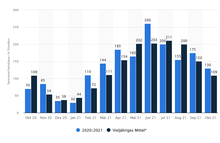 図1:2020/2021年のドイツ月別日照時間(青)と過去4年の平均値(紺)