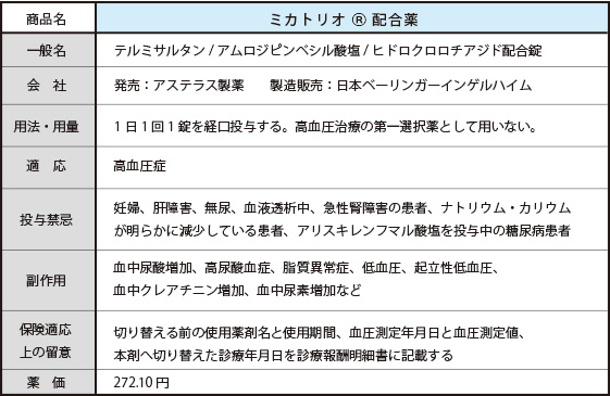 2016年11月、アンジオテンシンII受容体拮抗薬(ARB)、Ca拮抗薬及び利尿薬を配合したミカトリオ錠(一般名:テルミサルタン/アムロジピンベシル酸塩/ヒドロクロロチアジド配合錠)が発売されました。2成分の配合薬は多数ありますが、3成分を配合した高血圧症治療薬は国内初となります。