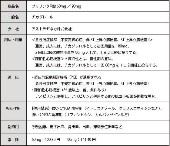 2017年2月、抗血小板薬のブリリンタ錠(一般名:チカグレロル)が発売されました。適応は、経皮的冠動脈形成術(PCI)が適用される急性冠症候群と心筋梗塞慢性期の血栓性イベント(心血管死、脳卒中)の発生抑制です。