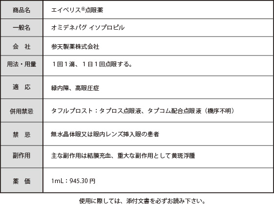 2018年11月、選択的EP2受容体作動薬という新しい作用機序の緑内障・高眼圧症治療薬のエイベリス点眼薬(一般名:オミデネパグ イソプロピル)が発売されました。