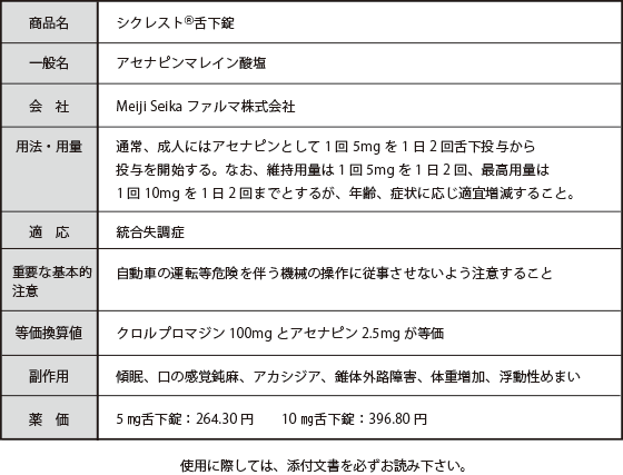 2016年5月、抗精神病薬のシクレスト舌下錠(一般名:アセナピンマレイン酸塩)が発売されました。定型抗精神病薬は、ドパミンD2受容体を強力に遮断して、統合失調症の陽性症状(幻覚・妄想など)を改善する反面、錐体外路症状や高プロラクチン血症などの副作用があります。セロトニン・ドパミン遮断薬(SDA)、多元受容体作用抗精神病薬(MARTA)、ドパミン部分作動薬(DPA)などの非定型抗精神病薬は、陽性症状に加えて、セロトニン5-HT2A受容体遮断作用により陰性症状(感情の平板化・意欲欠如など)にも効果があります。