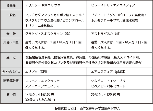 吸入ステロイド薬(ICS)、長時間作用性β2刺激薬(LABA)、長時間作用性抗コリン薬(LAMA)の3成分を配合したトリプル吸入薬が登場しました。2019年5月に発売されたテリルジー(フルチカゾンフランカルボン酸エステル/ウメクリジニウム臭化物/ビランテロールトリフェニル酢酸塩)と同年9月のビレーズトリ(ブデソニド/グリコピロニウム臭化物/ホルモテロールフマル酸塩水和物)です。