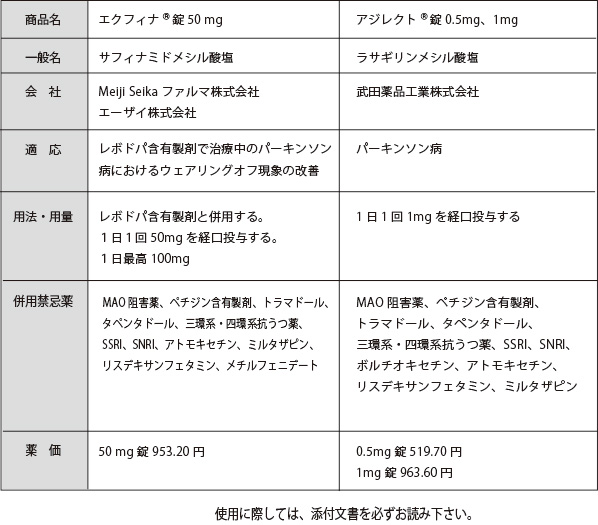 MAO-B阻害薬は、ドパミンの分解酵素であるMAO-B (モノアミン酸化酵素-B)を阻害し、脳内ドパミン濃度を高めます。また、レボドパ含有製剤との併用で、L-ドパが効いている時間(オン時間)が短くなり、次の服用前に症状が悪化するウェアリングオフ現象を軽減します。PDの早期治療における単独療法や進行期のレボドパ含有製剤との併用療法に用いられます。アジレクトとエクフィナは、エフピーとは異なりアンフェタミン骨格を有さないので、覚醒剤原料の規制を受けません。直接比較したデータはありませんが、アンフェタミン骨格による不眠症、異常な夢、心臓障害及び神経障害などのリスクが少ないと思われます。エクフィナ®は、既存MAO-B阻害薬と化学構造がまったく異なり、抗てんかん薬のラコサミドに似た構造を有します。可逆的なMAO-B阻害作用(既存薬は非可逆的)に加えて、PDの病態に深く関与するグルタミン酸の放出抑制作用(非ドパミン作動性作用)を持つので、運動症状だけでなく、精神症状や感覚症状などの非運動症状の改善が期待されます。MAO−B阻害薬の変更や中止後に三環系抗うつ薬などを開始する場合には、高血圧クリーゼやセロトニン症候群などの重篤なリスクを避けるため、少なくとも14日間の間隔を空ける必要があります。
