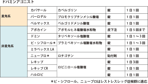 ドパミンアゴニストは、ドパミン D2 受容体を選択的に刺激します。運動症状の改善はやや劣りますが、作用時間が長く、日内変動の予防には優れています。65歳未満ではドパミンアゴニストによる治療開始が推奨されています。ドパミンアゴニストには、麦角系のパーロデル錠(一般名:ブロモクリプチンメシル酸塩)、ペルマックス錠(一般名:ペルゴリドメシル酸塩)、カバサール錠(一般名:カベルゴリン)と、非麦角系のドミン錠(一般名:タリペキソール塩酸塩)、ビ・シフロール錠/ミラペックスLA錠(一般名:プラミペキソール塩酸塩水和物)、レキップ錠(一般名:ロピニロール塩酸塩)、アポカイン皮下注(一般名:アポモルヒネ塩酸塩水和物)、ニュープロパッチがあります。麦角系は心臓弁膜症や肺・胸膜線維症などの重篤な副作用があります。非麦角系は突発的睡眠や傾眠の副作用があるため、自動車の運転等には注意が必要です。また、高齢者では、ドパミン製剤に比べ、幻覚・妄想等の精神症状が発現しやすくなります。