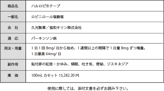 2019年12月、パーキンソン病(PD)治療薬のハルロピテープ(一般名:ロピニロール塩酸塩)が発売されました。ニュープロパッチ(一般名:ロチゴチン)に続く2剤目の経皮吸収型ドパミンアゴニストです。