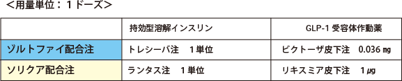 2019年9月、国内初となる基礎インスリン(持効型溶解インスリンアナログ)とGLP-1受容体作動薬の配合注射薬のゾルトファイ配合注〔一般名:インスリン デグルデク(遺伝子組換え)/リラグルチド(遺伝子組換え)〕、2020年6月には、2剤目となるソリクア配合注〔一般名:インスリン グラルギン(遺伝子組換え)/リキシセナチド〕が発売されました。