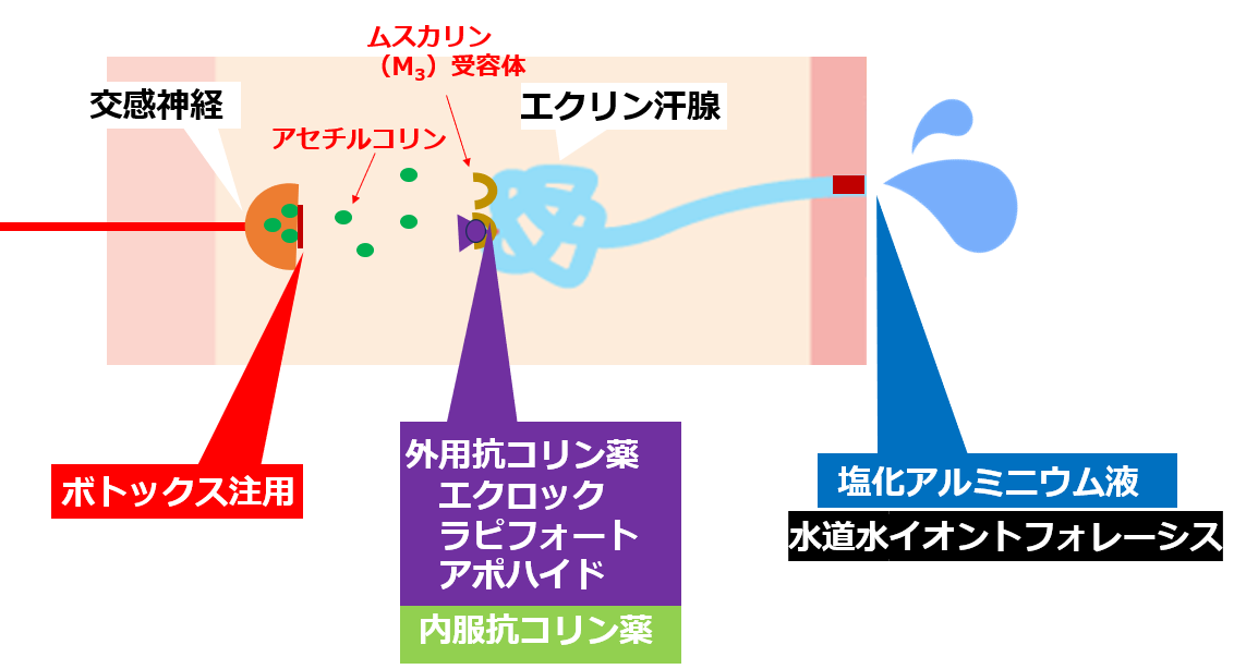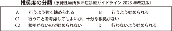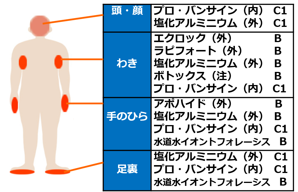 体温が上昇すると、交感神経の節後線維からアセチルコリンが放出され、ムスカリン受容体のサブタイプ(M3)を刺激することで、エクリン汗腺からの発汗を促します。多汗症治療薬の作用機序を整理します。ボトックス注用は、交感神経終末からのアセチルコリン放出を抑制することで、抑汗作用を示します。塩化アルミニウム液と水道水イオントフォレーシスは、汗の通り道(汗管)の出口を塞ぐことで、汗の分泌量を減らします。内服および外用抗コリン薬は、アセチルコリンがムスカリン受容体(M3)に結合するのを阻害して、過剰な発汗を抑えます(図)。原発性局所多汗症診療ガイドラインにおいて、外用抗コリン薬は塩化アルミニウム液や水道水イオントフォレーシスと同じ第一選択の治療法に位置づけられました。部位ごとに推奨される治療薬とガイドライン上の推奨度(A~D)をまとめました(図)。