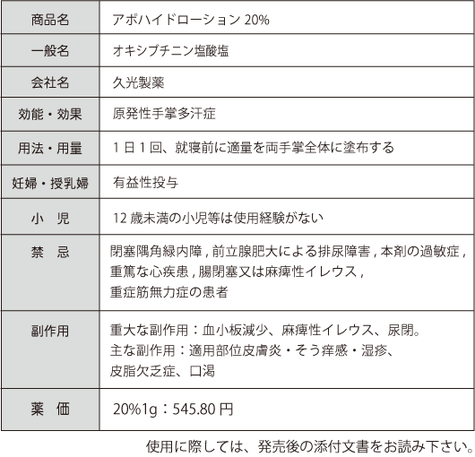 2023 年 6 月、アポハイドローション(一般名:オキシブチニン塩酸塩)が発売されました。日本初の原発性手掌多汗症(手汗)治療薬です。同一成分薬に頻尿治療薬のポラキス錠と過活動膀胱治療薬のネオキシテープがあります。