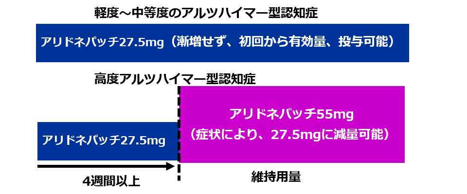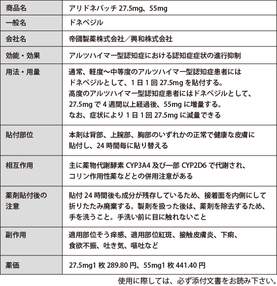 アリドネパッチは、服薬困難や寝たきりの患者にも有用で、食事や併用薬との服用タイミングを考慮するなどの制約がありません。また、投与状況を視認できるので、介護者による服薬管理が容易になります。経口薬は、コリン作動性の胃腸障害を軽減するため、有効用量ではない3mgから開始しますが、貼付薬は血中薬物濃度の上昇が緩やかなため、軽度及び中等度 AD では、ローディングドーズを必要とせず、経口5mgに相当する27.5mgから開始できます。高度ADの場合には、27.5mgで4週間以上経過後に、55mg(経口10mgに相当)に漸増します。下痢、食欲不振などの消化器症状は1~3%未満と、経口薬と同程度に発現します。製剤は、27.5mg(8.1×8.1cm)、55mg(8.9×13.4cm)で、鎮痛消炎剤のモーラステープ(7×10cm)、同L(10×14cm)よりやや小さめのサイズです。適用部位の皮膚症状は、そう痒感(24.9%)、紅斑(24.3%)、接触皮膚炎(12.6%)と高頻度に発現します。連日の貼付・除去により皮膚角質層が剥離し、血中濃度が増加するおそれがあります。このため貼付部位を毎回変更し、同一部位への貼付は、7日以上間隔をあけます。光線過敏症の防止のため、衣服で隠れる部位を選び、剥がした後も貼付部位への直射日光を3週間は避けます。他のコリンエステラーゼ阻害薬(ドネペジル塩酸塩、リバスチグミン、ガランタミン)とは併用できません。また、ADによる影響や意識障害、めまい、眠気等などの副作用があるので、自動車の運転等はしないよう指導します。