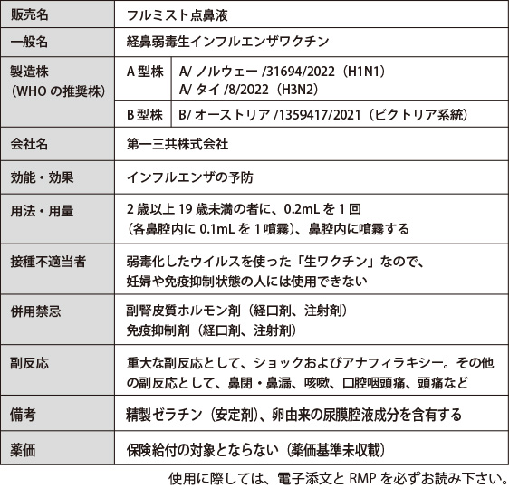 2024 年 10 月、国内初の経鼻(鼻腔噴霧型)インフルエンザワクチン、フルミスト点鼻液(一般名:経鼻弱毒生インフルエンザワクチン)が発売されました。接種対象者は2歳以上19歳未満で、既存の不活化インフルエンザHAワクチンに比べ、「注射せず痛くない」「1回の接種で済む」などのメリットがあります。