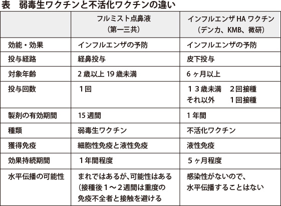 日本小児科学会は『経鼻弱毒生インフルエンザワクチンの使用に関する考え方』を公表し、2〜19歳未満に対しては、不活化インフルエンザHAワクチンと経鼻弱毒生インフルエンザワクチンを同等に推奨する。喘息患者、授乳婦、周囲に免疫不全患者がいる場合は不活化インフルエンザHAワクチンを推奨する。これは被接種者から未接種者への水平伝播のリスクが懸念されるためです(いわゆるシェディング)。また、生後6ヵ月〜2歳未満、19歳以上、免疫不全患者、無脾症患者、妊婦、ミトコンドリア脳筋症患者、ゼラチンアレルギーを有する患者、中枢神経系の解剖学的バリアー破綻がある患者に対しては、不活化インフルエンザHAワクチンのみを推奨するとしています。