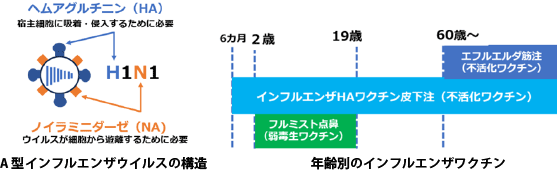 インフルエンザウイルスの外膜(エンベロープ)には、宿主細胞に侵入する際に必要なヘムアグルチニン(HA)とウイルスの増殖後、宿主細胞から遊離する際に必要なノイラミニダーゼ(NA)という突起(スパイク)があります。ワクチンは、HAを抗原にした感染力のない不活化ワクチンです。臨床的に問題となる季節性インフルエンザは、A型とB型です。A型はHA16種類、NA9種類のサブタイプがあり、変異が激しく、毎年、微細な変化を繰り返します。一方、B型は遺伝子的に安定しているため変異が少ないです。標準用量のインフルエンザワクチンは、A型(H1N1亜型、H3N2亜型の2種類)とB型(ビクトリア系統、山形系統の2種類)の4価ワクチン、各15μgずつ計60μgの抗原を含有しています。ワクチンは、基礎疾患のない若年成人では中等度の有効性を示します。一方、加齢による免疫機能の低下(免疫老化)やフレイル、合併症が多い高齢者では、十分な免疫応答が得られにくいことが知られています。そこでエフルエルダは抗原量を1株当たり4倍の60μg(計240μg)に増量し、接種方法を皮下注から筋注に変更しました。不活化ワクチンは血流が少ないと十分な免疫を誘導できないため、海外では筋注が推奨されています。治験データでも、標準用量製剤を凌駕する抗体上昇が認められました。高齢者は筋注による接種刺激で迷走神経反射(失神・徐脈・めまい)を起こす可能性があるので、接種後30分程度はゆっくり腰掛けるなど、体調に変化がないことを観察します。単回接種用のプレフィルドシリンジ製剤のため、チメロサール(防腐剤)フリーです。